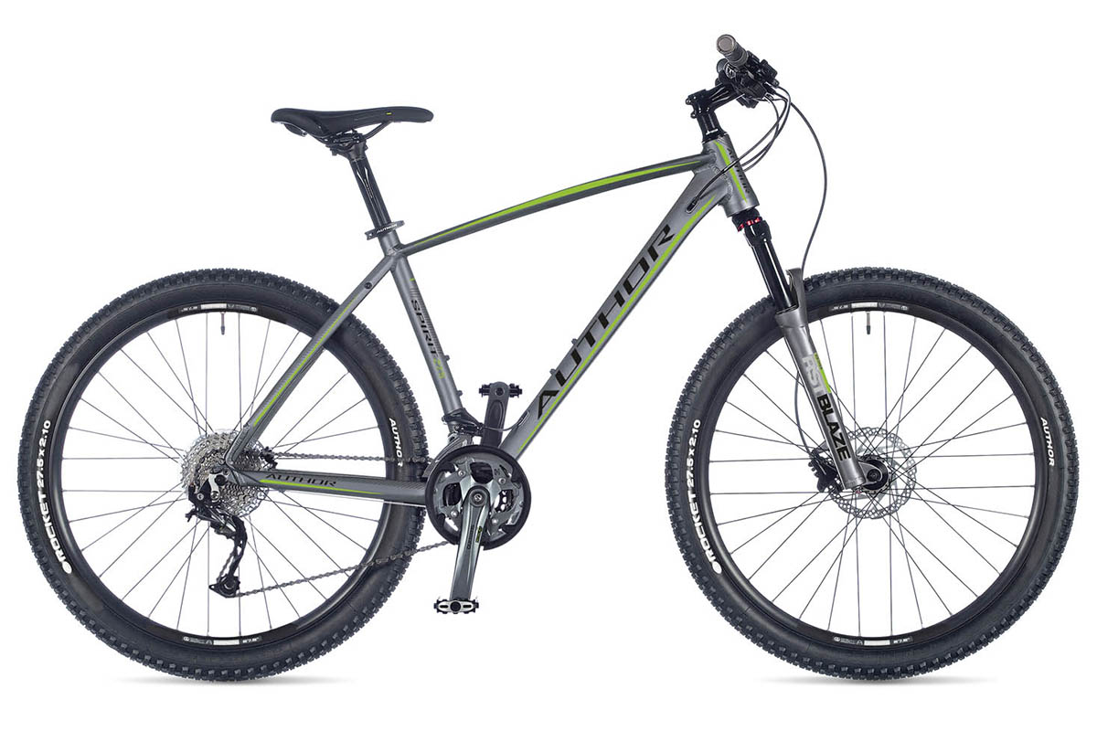 Author Spirit - горный велосипед на 27.5-дюймовых колесах. Гидроформинг труб алюминиевой рамы, амортизационная вилка с блокировкой и конусной рулевой, гидравлические дисковые тормоза и привод Shimano Alivio на 27 скоростей и шлицевая каретка.